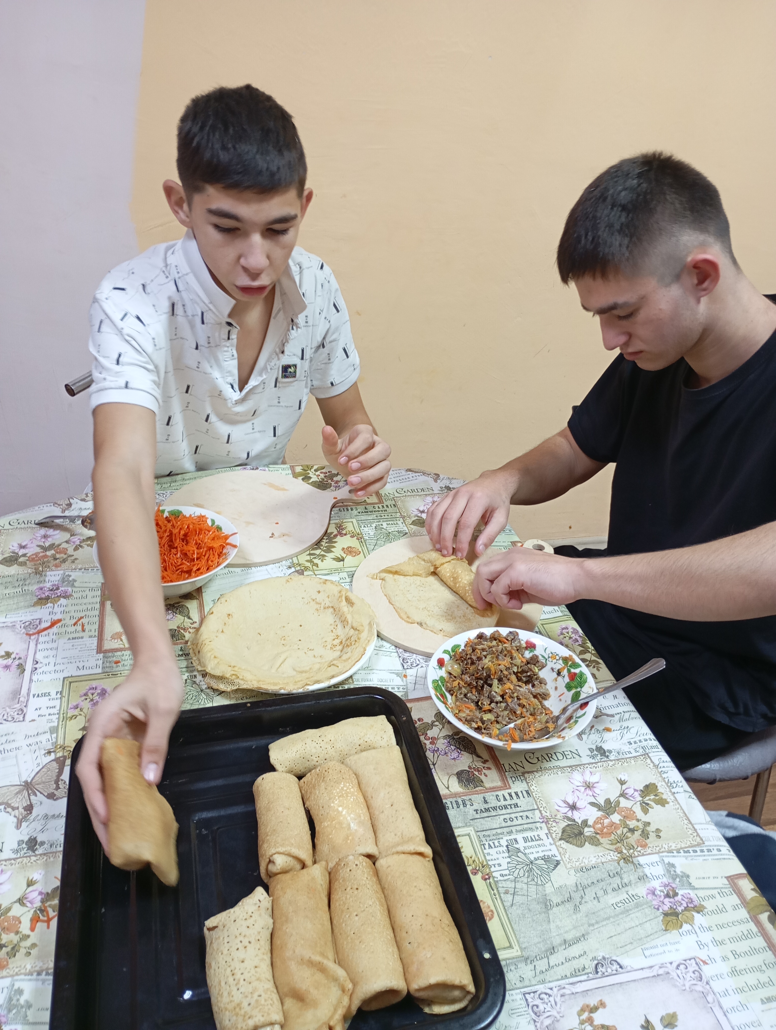 В рамках реализации кружка « Хозяюшка» , воспитанники приготовили блинчики с начинкой. Одно загляденье было наблюдать за тем, как девчонки погружаются в творческий процесс: замесили тесто, подготовили начинку, испекли блины. Мальчишки не остались в стороне, с удовольствием помогали им. Работа спорилась и ребята не заметили, как закончилось тесто, а на столе появилась гора блинчиков. Блины вышли просто восхитительными!